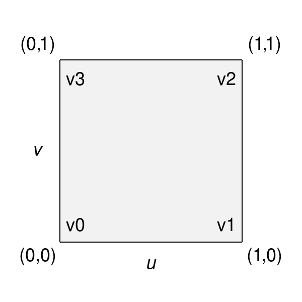 Each face of the mesh has an implicit local 2D parameterization and individual coordinates of that parameterization are used to evaluate its corresponding Surface. In general, 3- and 4-sided faces use the same parameterizations for quad and triangular patches used elsewhere in OpenSubdiv: