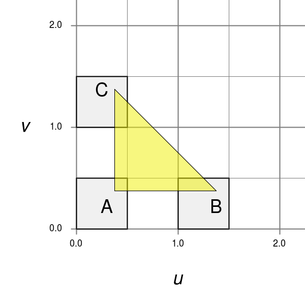 A triangle subdivided with a quad-based scheme (e.g. Catmull-Clark) will therefore not have the parameterization of the triangular patch indicated previously, but another defined by its quad sub-faces illustrated above (to be described in more detail below).