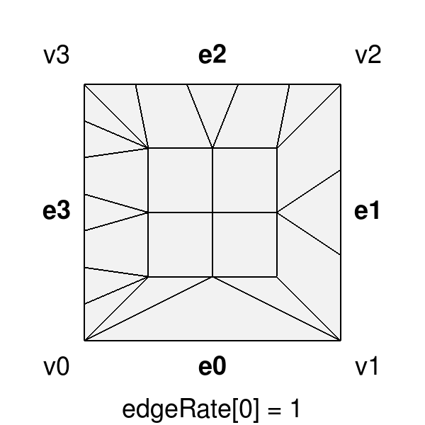 More complex non-uniform patterns allow the edges of the face to be split independently from the interior of the face. Given rates for each edge, a suitable uniform rate for the interior can be either inferred or specified explicitly. These are typically referred to as the "outer rates" and the "inner rate". (The single rate specified for a simple uniform tessellation is essentially the specification of a single inner rate while the outer rates for all edges are inferred as the same.)