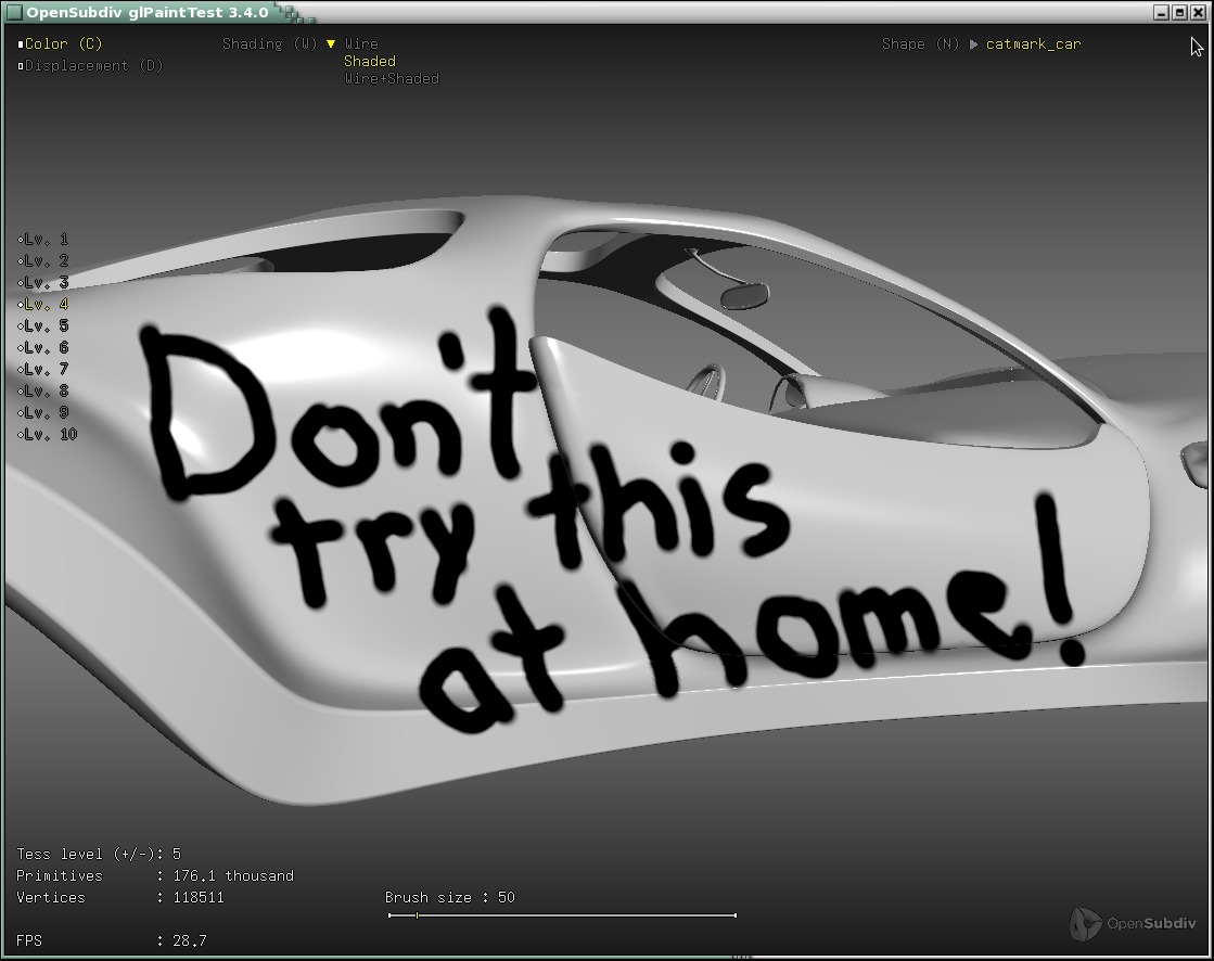 glPaintTest is a small stand-alone application showing the potential of using GPU limit tessellation for painting and sculpting applications.