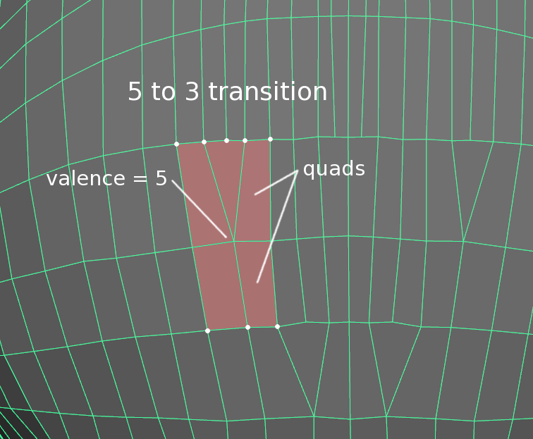 It is often necessary to vary the density of control vertices over the surface mesh: areas around the fingers of a hand require more CVs than the comparatively simpler region around the palm. It is important to handle the topology around these transitions efficiently.