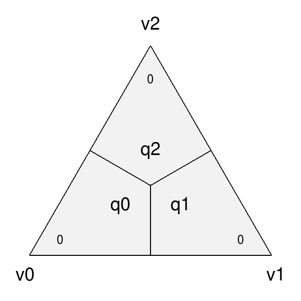 A triangle subdivided with a quad-based scheme (e.g. Catmull-Clark) will therefore not have the parameterization of the triangular patch indicated previously, but another defined by its quad sub-faces illustrated above (to be described in more detail below).