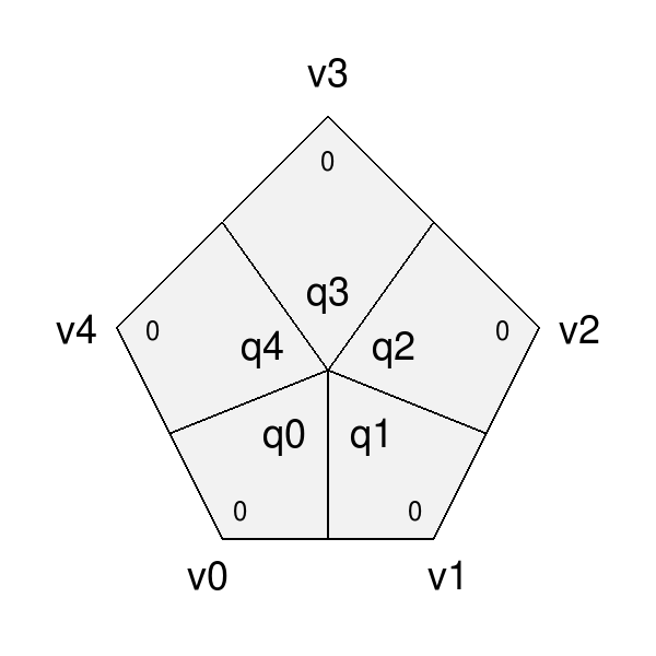 Note also that the edges of each sub-face are of parametric length 0.5, which results in a total parametric length of 1.0 for all base edges. This differs again from Ptex, which parameterizes sub-faces with edge lengths of 1.0, and so can lead to inconsistencies in parametric scale (typically with derivatives) across edges of the mesh if not careful.