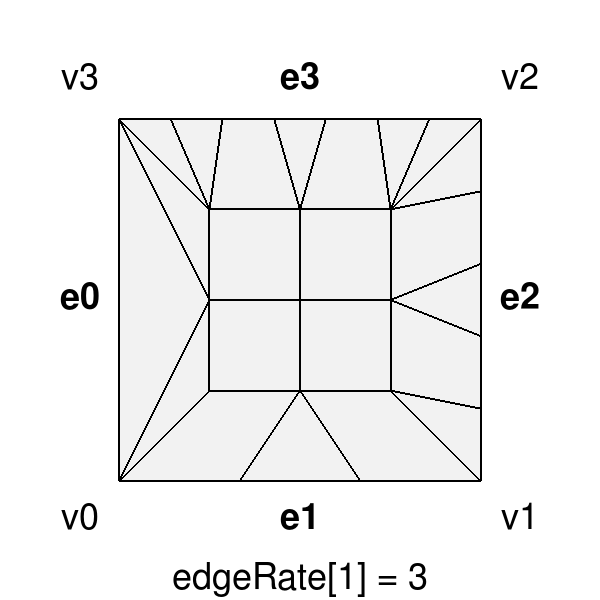 More complex non-uniform patterns allow the edges of the face to be split independently from the interior of the face. Given rates for each edge, a suitable uniform rate for the interior can be either inferred or specified explicitly. These are typically referred to as the "outer rates" and the "inner rate". (The single rate specified for a simple uniform tessellation is essentially the specification of a single inner rate while the outer rates for all edges are inferred as the same.)