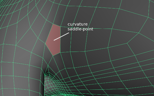 Used sparsely, non-quads can be very useful to gather 3 or more diverging edge-loops. These are often encountered in highly deforming areas with curvature saddle-points (ex: arm-torso connection). The strategic placement of a pentagon in one of these critical spots ensures that the surface remains smooth, while allowing for complex topology to flow around.